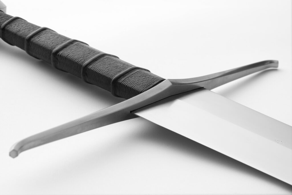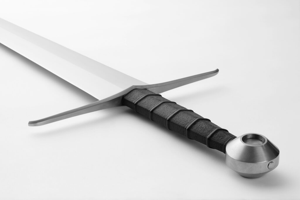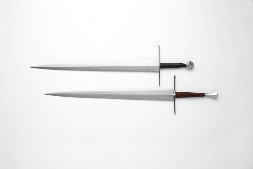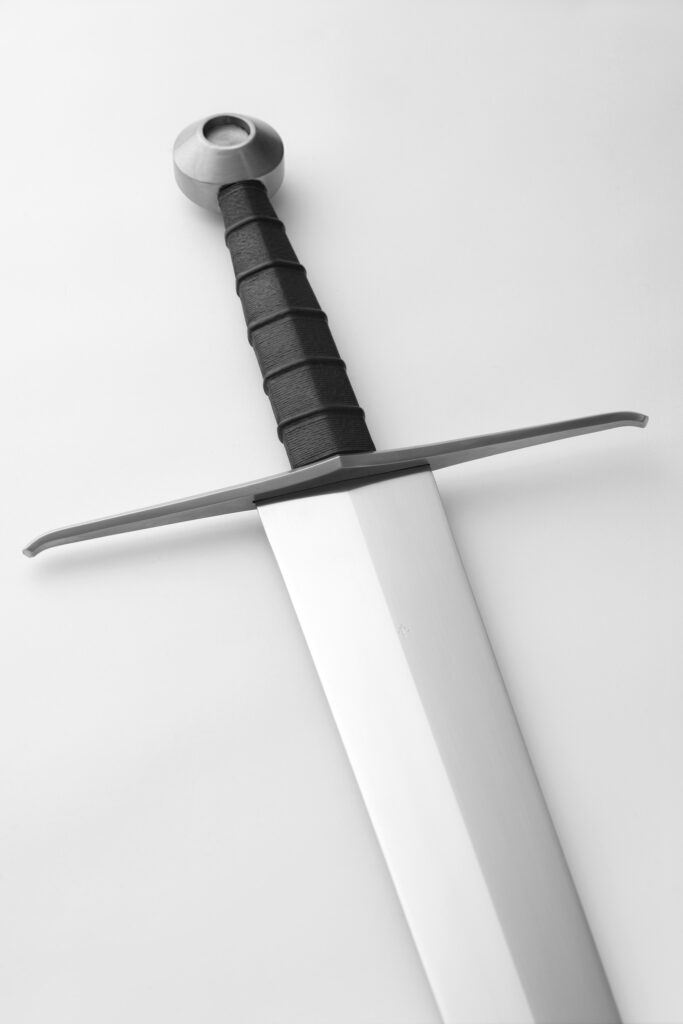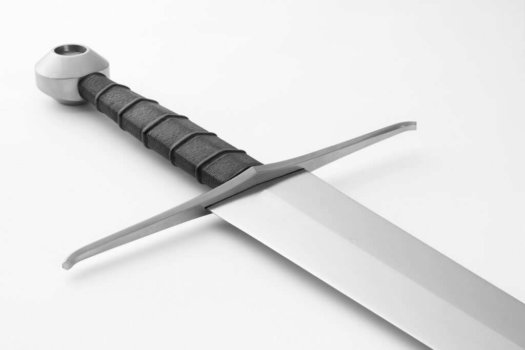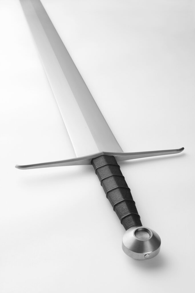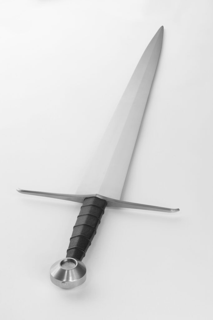 The guard is wide and slim with a hexagonal cross section. There is a marked widening at the middle that matches the midrib of the blade. This type of guard seems to have been especially popular in Italy in the late 14th and early 15th centuries. The pommel is a deep wheel type pommel with a circular hollow in the mid face. Since it is nearly hemispherical in proportion it allows for a good amount of mass without being too big. The overall proportions of the Next Generation Alexandria closely matches a number of original swords in the group. A short video demonstrates how the proportions are defined with geometry, following principles that were used by medieval artisans in the Gothic period.