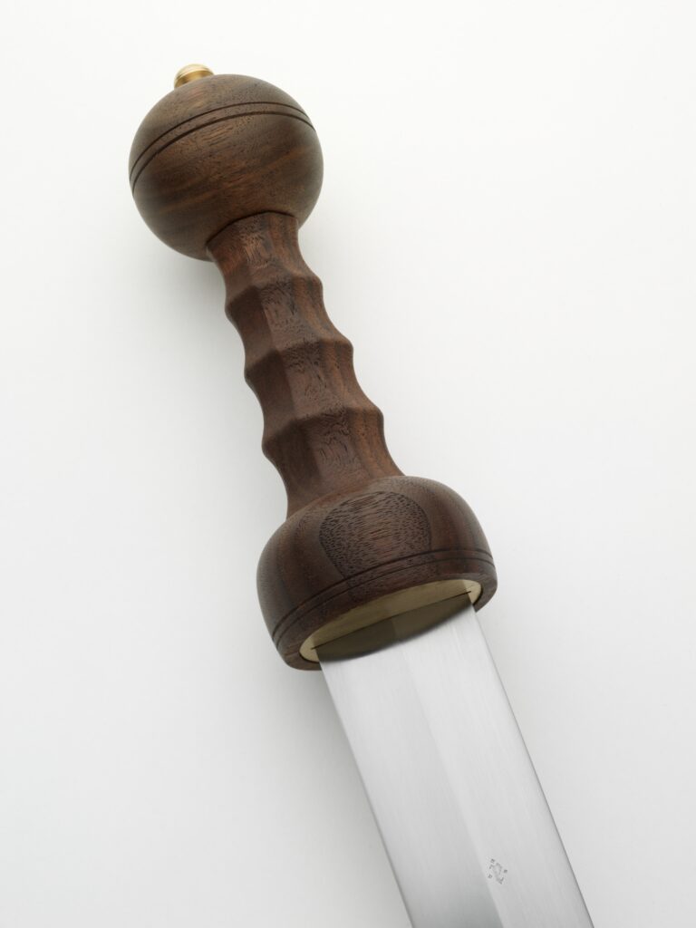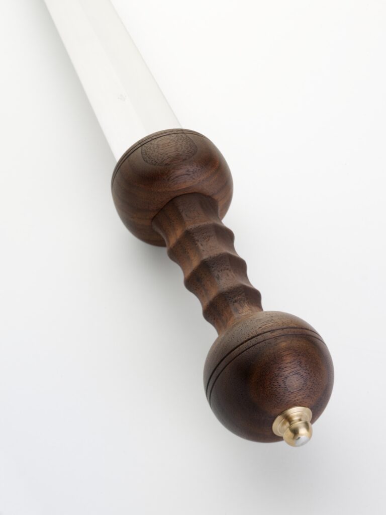 We chose to use one single kind of wood for all components of the hilt, as would often have been the case in Roman times. The walnut wood is given a 24 hr soak in linseed oil, left to harden over 48 hours and then polished on a cloth wheel. This treatment helps to seal the wood against moisture and gives a soft satin sheen that deepens the natural colors.