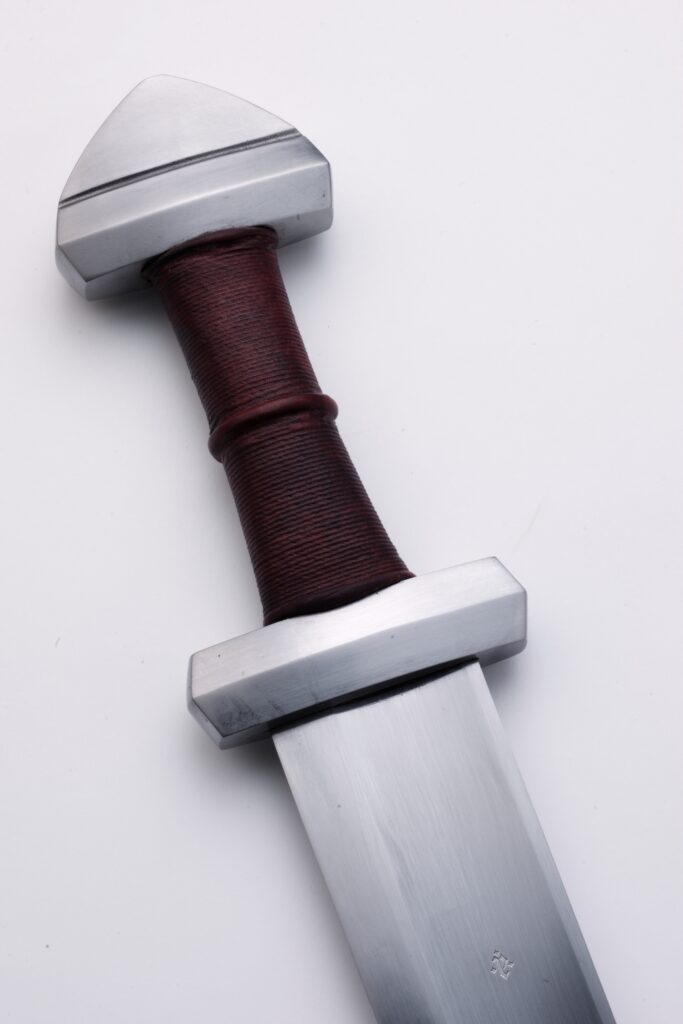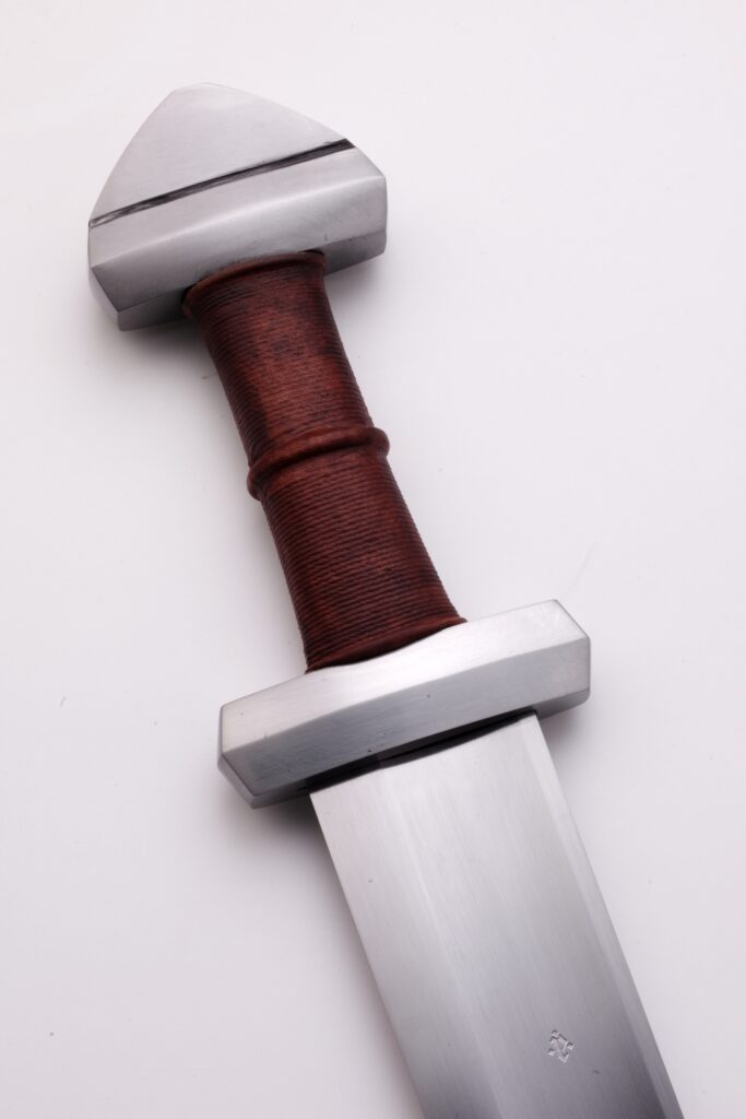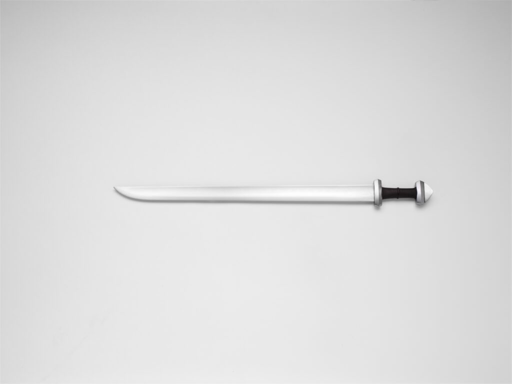 This sword was inspired by a splendid weapon discovered 1909 in the remains of a burial mound at North Arhus Farm, Hjartdal Parish, Telemark, Norway. This is one of the most beautiful examples of this type. The dimensions of the blade on the Berserker will be very close to this particular original. The Berserker is also influenced by other single edged swords Peter has seen and handled. Although being a hybrid of the features of several swords, it is still a clear example of the type based on study of originals.