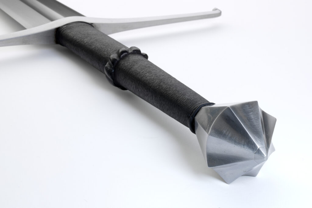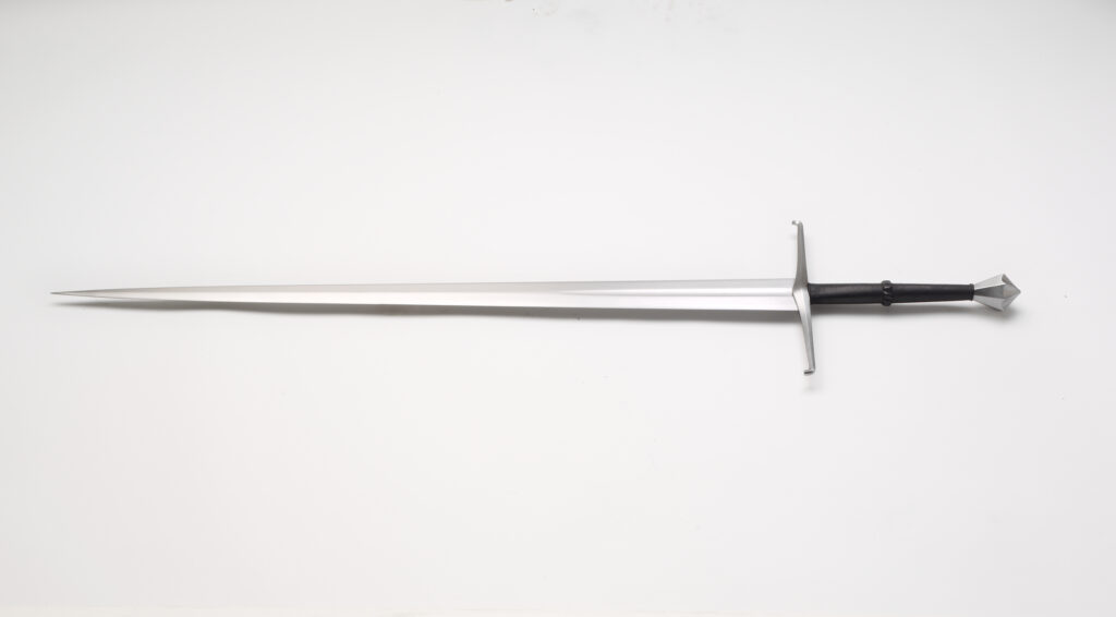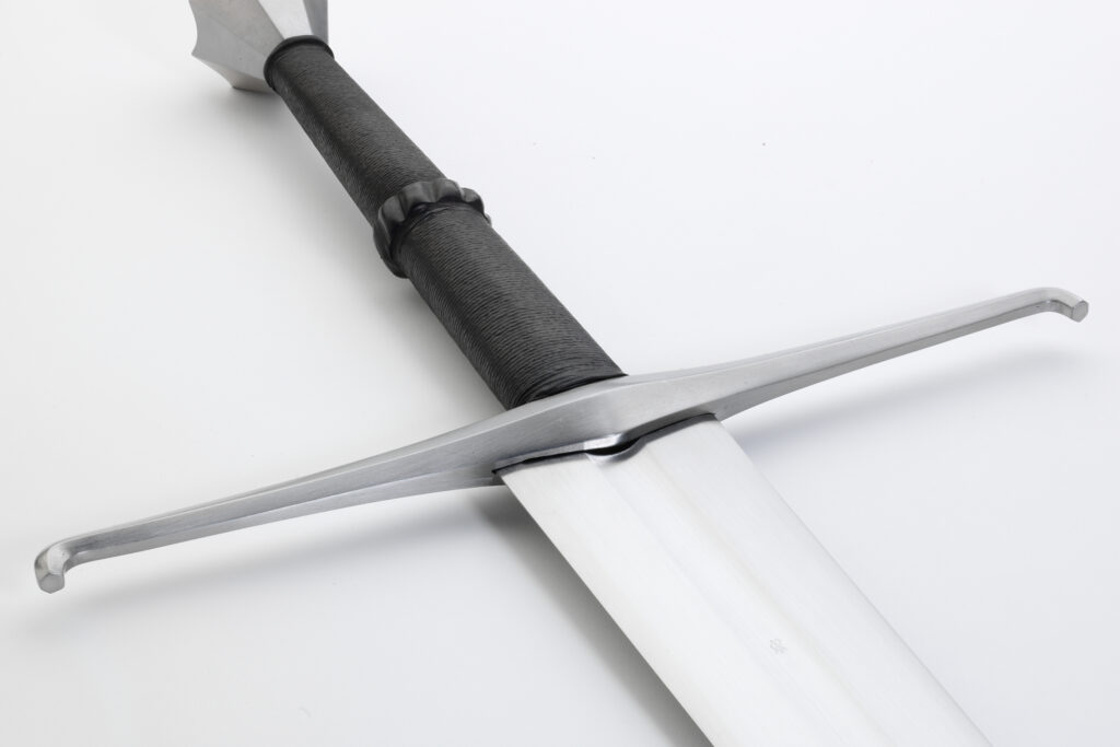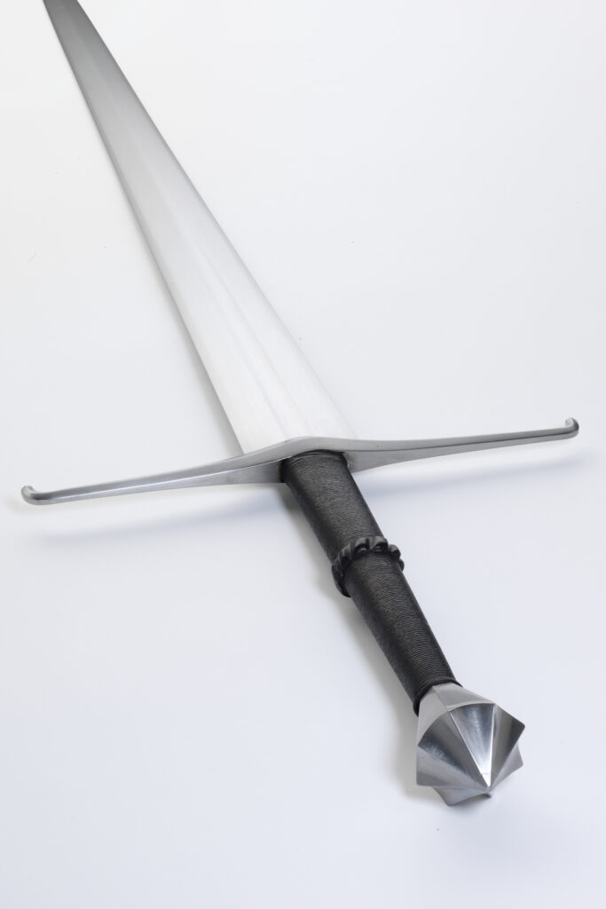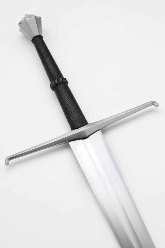 The blades are hand-ground and finished to a high satin finish and sharpened like the original sword: the edge bevels run gradually to the keen cutting sharpness. Each blade is individually heat treated in Albion’s Forge Shop for maximum flexibility and cutting performance. The wooden core of the grip is bound with cord for extra strength and covered with leather. The cross with its down-turned ends and its faceted pommel are all hand finished and mounted to fit individual blades.