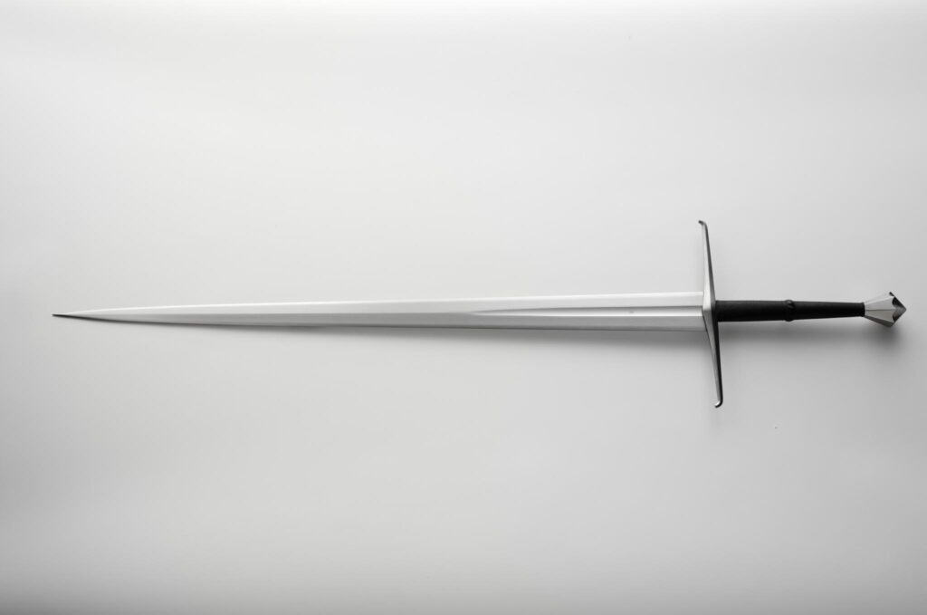 This long sword is referred to as “spadona da una mano e mezza” or longsword of one hand and a half and dates from the mid 1400’s. It is born from a meeting between great sword manufacturing areas. The blade was forged by one of the masterful swordsmiths in the renowned workshops of Passau, in southern Germany. From here it was exported to a north Italian sword cutler who mounted the blade according to his and his customers ideals. The beautifully proportioned hilt is of Italian manufacture in a style that was popular during the first half of the15th century. The well-forged cross combines graceful shape with sturdy construction, and the pommel is octagonal with its upper faces hollowground for an elegant appearance and deadly effect in close quarter combat. The sword could be described as an Oakeshott type XVIIIa or possibly a XVIa as described in “The Sword in the Age of Chivalry”.