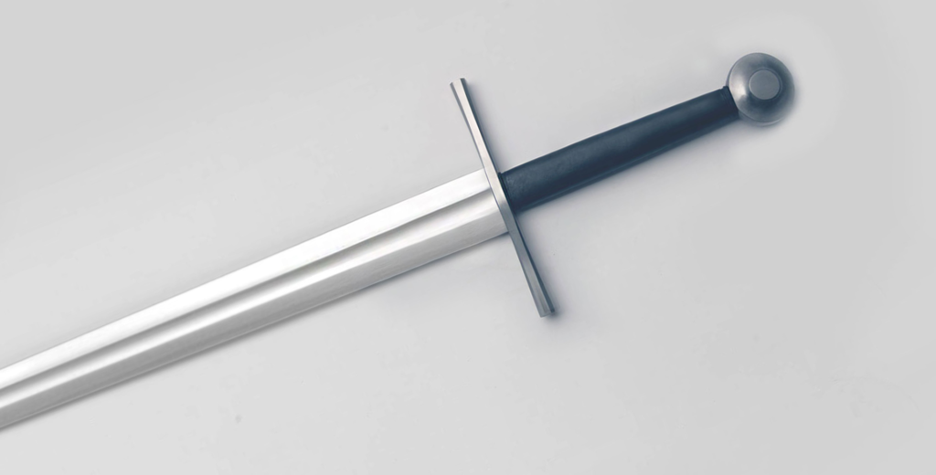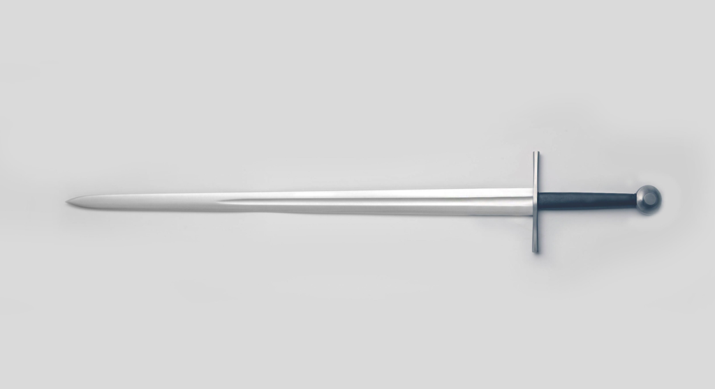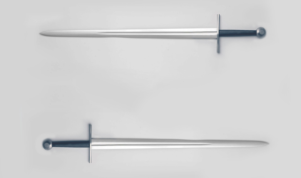 When seeing original swords of war from the 13th and 14th C., one is always impressed by their powerful presence. A massive size combines with harmonic proportions, lending them a majestic grace. This visual impact follows through in their handling: a strong authority combined with a smooth control of edge and point. Two major types of these battlefield weapons are classified as Oakeshott type XIIa ad XIIIa. They generally have a blade length of 85-95 cm, when in hand and a half size. Their grips give ample room for two hands. Despite being rather massive they have such a balance that they could be wielded in one hand, although two-handed use was probably preferred. Those weapons classified by modern students of arms as Oakeshott type XIIa are recognized by being wide at the base and tapering to a well defined point. This is a sword for the battlefield but can be used in the fencing techniques of Liechtenauer, although the wide blade does not lend itself too well for half-swording. These swords will not be sold sharp, unless otherwise requested by the customer (sharpening available for a small additional fee.).The grip is of stabilized birch, wrapped with black leather.