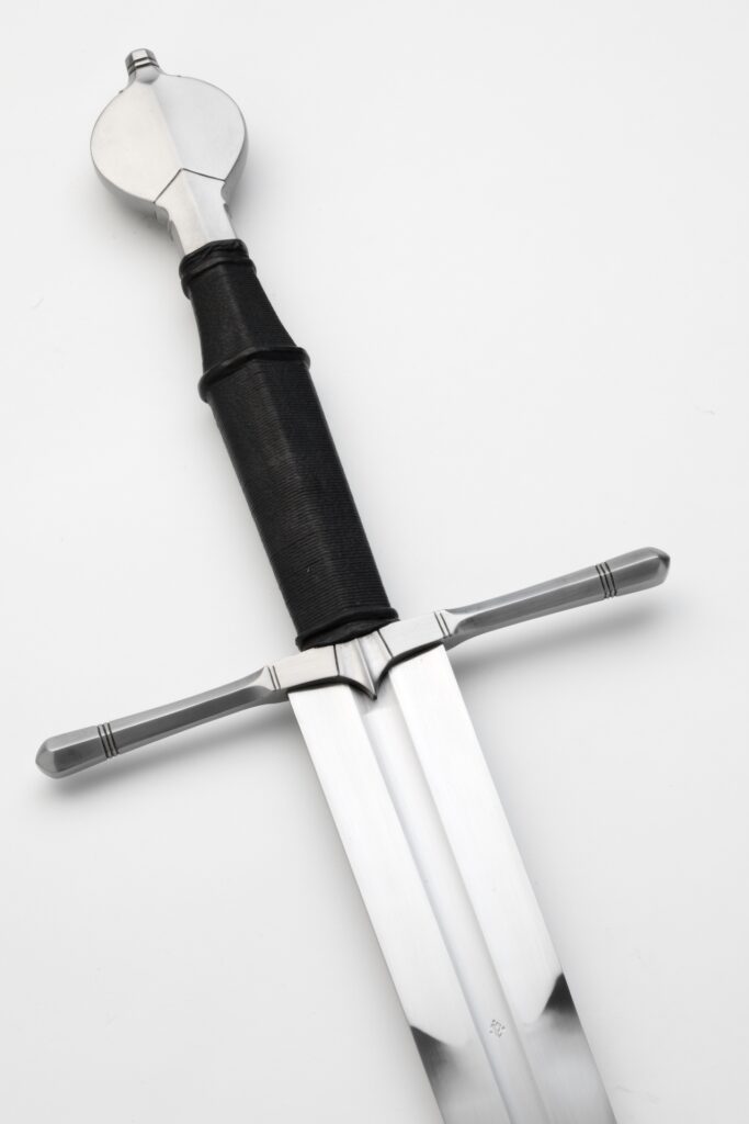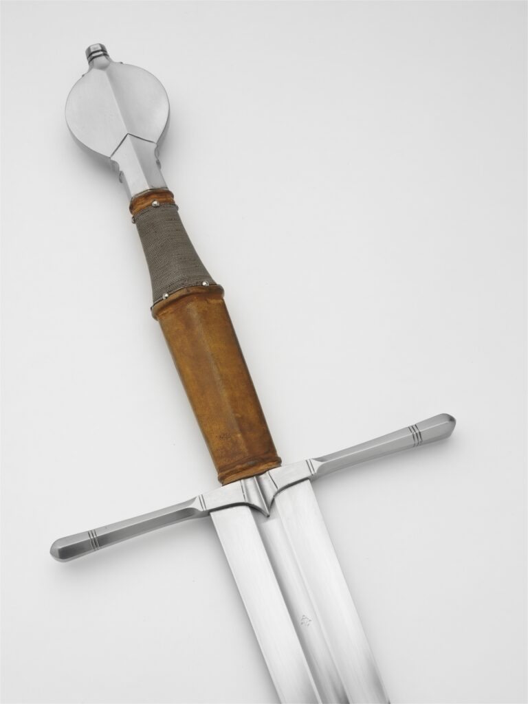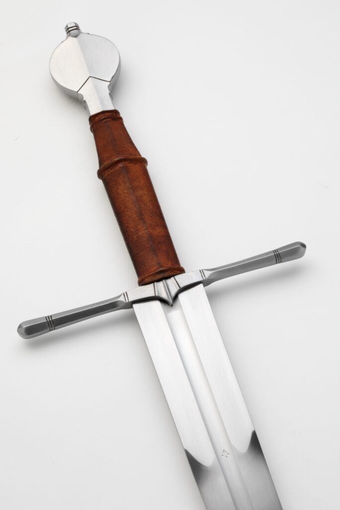 The cross is hexagonal in section with clubbed ends and a sharp cusp or écusson in the middle. It is simple in outline, yet has a refined character. The pommel is an Oakeshott type U: a leaf shaped pommel with prominent midrib and often hollow ground sides. You often see subtle but effective filework and sculpting on these pommels. The grip is waisted with a riser on the widest part.