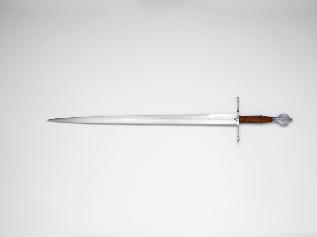 The blade on this sword is a larger scale version of a long and slender single hand sword that is kept at the Royal armouries in Leeds.